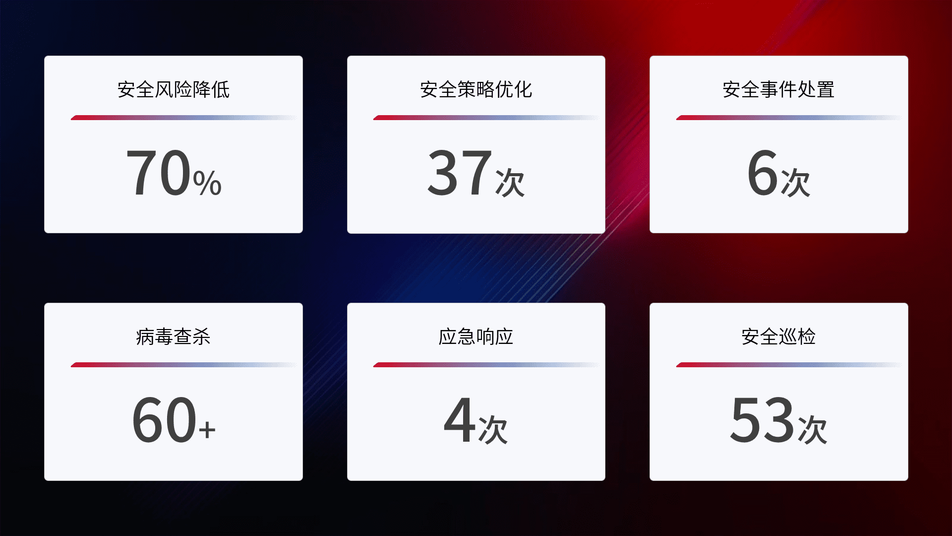 提供全面的安全事件报告体系,,,包括处置报告、、、、周报、、季度和年度总结,,,结合持续监控,,,帮助客户深入了解网络安全状况。。。