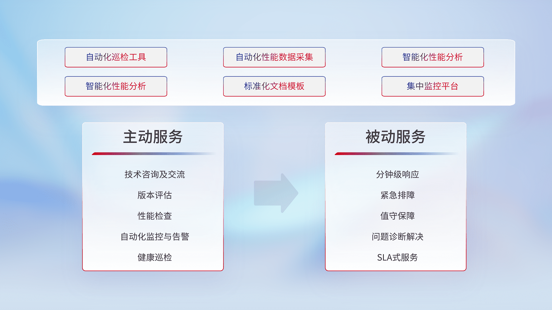 智能化工具和标准化文档,,保障服务质量,,提供主动服务(包含技术咨询、、版本评估、、、性能检查、、、自动化监控与告警、、、健康巡检)和被动服务包含(分钟级响应、、、紧急排障、、、、值守保障、、问题诊断解决、、、、SLA服务)。。。。