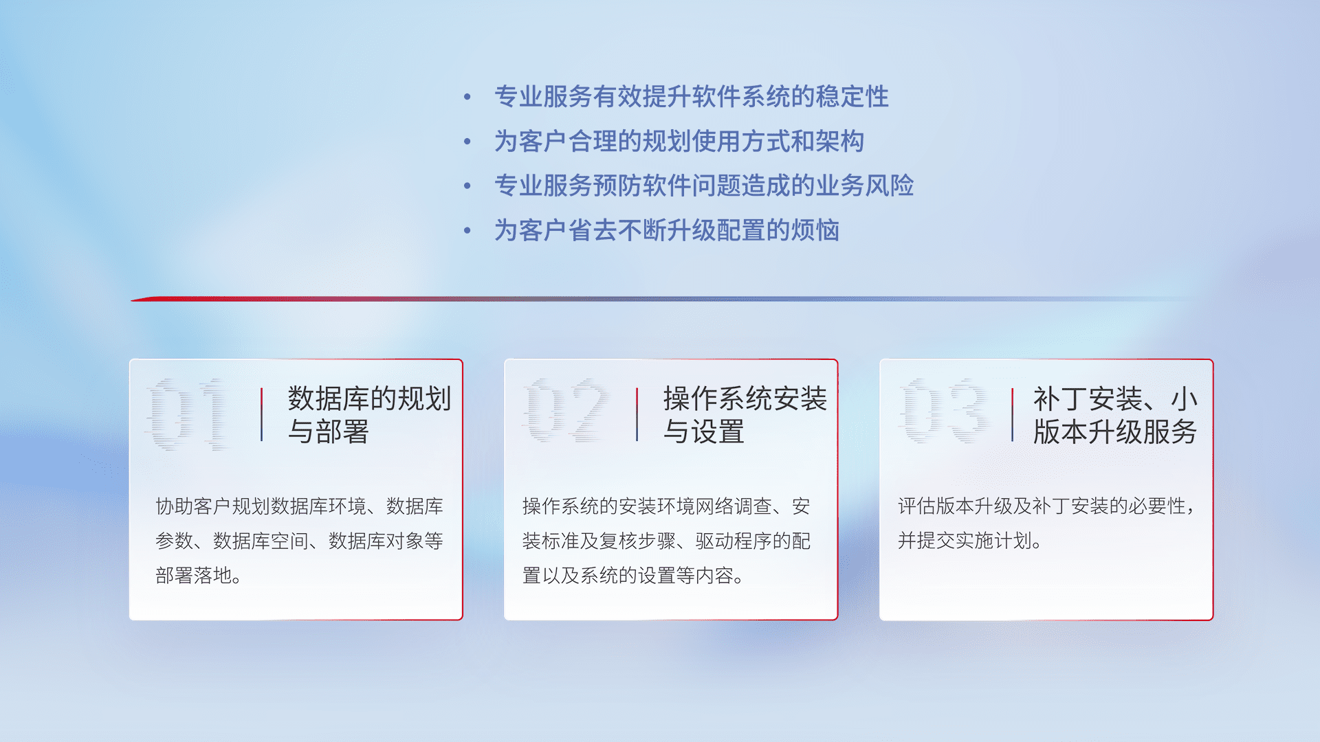 为客户提供软件规模升级、、快速部署、、、按需配置的专业服务,,从数据库的规划与部署到操作系统的安装与设置,,,再到补丁安装和小版本升级提供支持。。。
